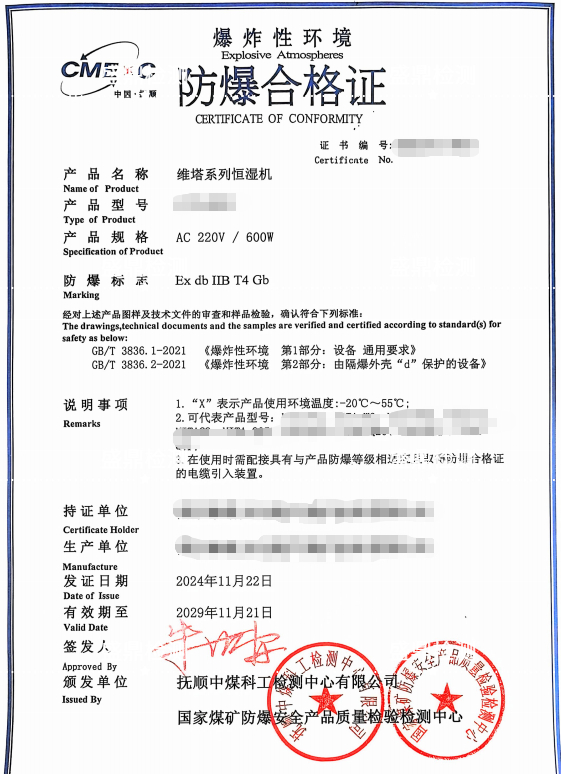 維塔系列恒濕機(jī)防爆認(rèn)證案例