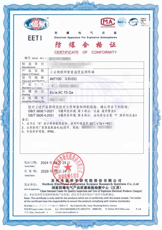 工業物聯網智能溫度監測終端防爆合格證