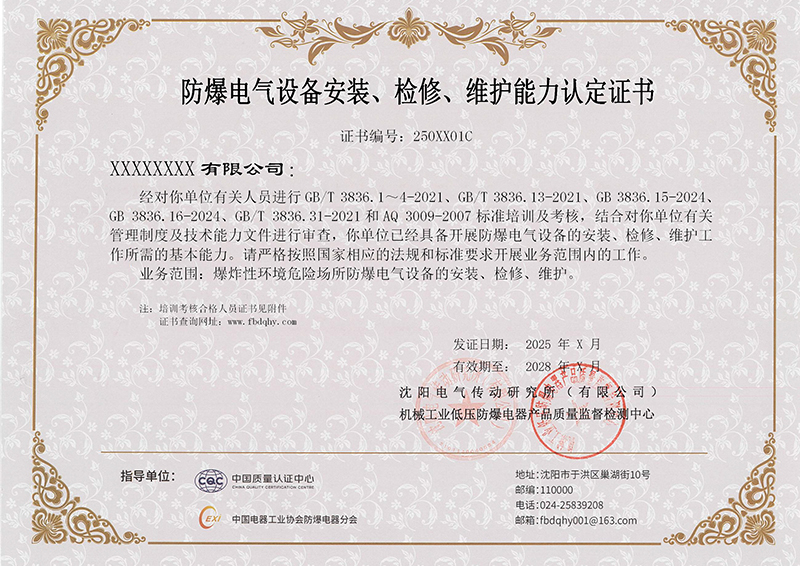 5、審核合格后,國家防爆檢測中心發放《防爆電氣安裝、檢修、維護資格證書》。公司和個人均獲得培訓合格證書。