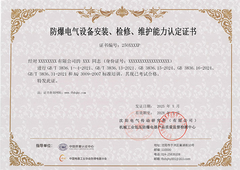 《防爆電氣設(shè)備安裝檢修維護(hù)能力認(rèn)定證書》培訓(xùn)依據(jù)的標(biāo)準(zhǔn)之一已經(jīng)更新為G8 3836.15-2024和G8 3836.31-2021版本,并于2025年8月1日正式實(shí)施,因此《防爆電氣設(shè)備安裝檢修維護(hù)能力認(rèn)定證書》也正式更新證書版本。這次的更新證書名稱也有明顯的變化,由原來的《防爆電氣設(shè)備安裝檢修維護(hù)技術(shù)培訓(xùn)證書》升級為《防爆電氣設(shè)備安裝檢修維護(hù)能力認(rèn)定證書》,最新的證書部分樣板參考如下。