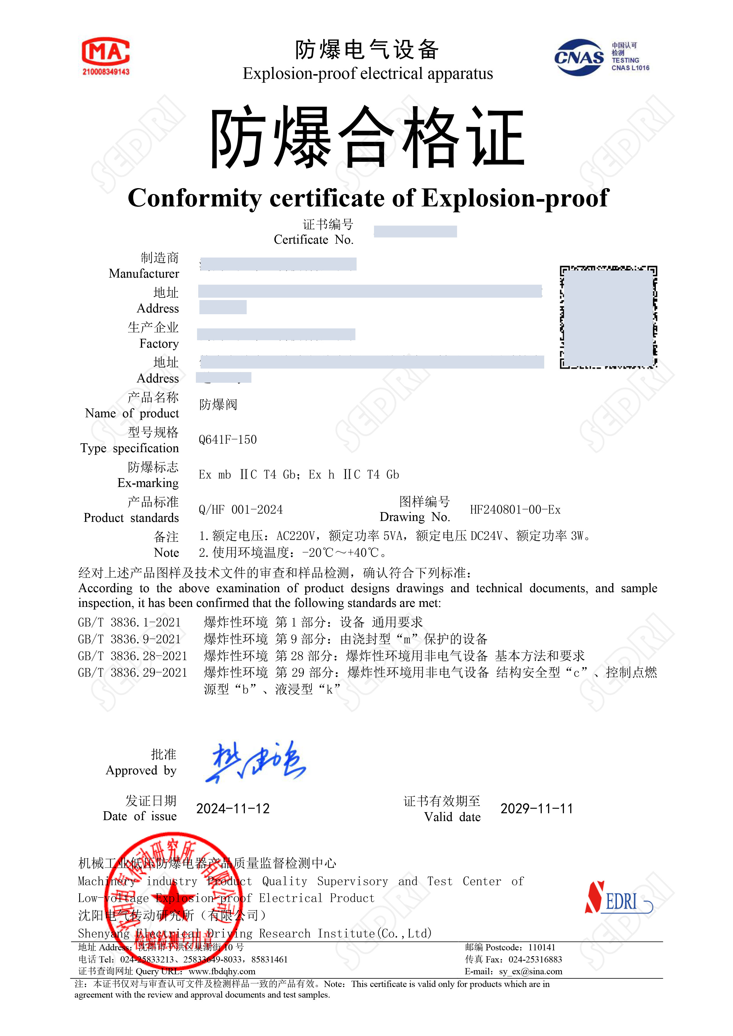 5.認證機構和頒證日期:防爆合格證書還會列出認證機構的名稱、地址及認證發證日期。認證機構通常是經國家授權的專業第三方檢測機構,負責對產品的設計、生產、測試等進行全面審核。證書頒發日期表示該證書的有效時間范圍。